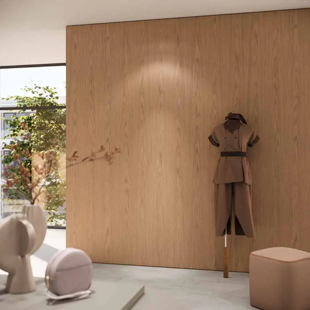 Il nuovo decoro senza ripetizioni stabilisce nuovi standard nella riproduzione di effetti legno naturali per applicazioni su grandi superfici. Come pannello truciolare nobilitato, il nuovo H1316 ST17 Rovere Bookmatch presenta un caratteristico aspetto fiammato senza ripetizioni su tutta la lunghezza di 2.800 mm e la larghezza di 2.070 mm. Nella versione in laminato non ci sono ripetizioni nemmeno su una lunghezza di 3.050 mm.