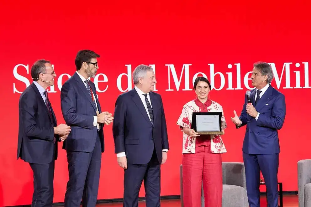 Conferimento del riconoscimento Ambassador del design italiano nel mondo al Salone del Mobile.Milano Alla presenza di: On. Antonio Tajani, Vicepresidente del Consiglio dei Ministri e Ministro degli Affari Esteri e della Cooperazione Internazionale; Luca Palermo, Amministratore Delegato e Direttore Generale di FederlegnoArredo Eventi S.p.A.; Maria Porro, Presidente del Salone del Mobile.Milano e Claudio Feltrin, Presidente di FederlegnoArredo. Courtesy of Salone del Mobile.Milano